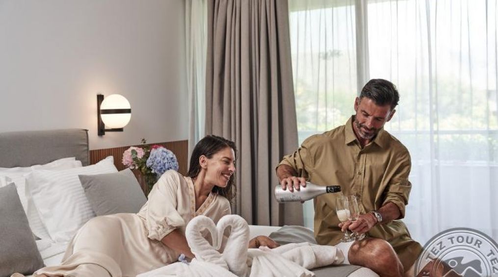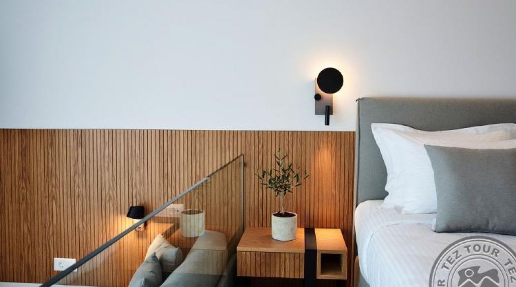 deluxe suite (изглед градина или басейн, гостна, спалня с врата, основно легло – 2 единични или king size (спалня по запитване), доп. – диван или разтегателно легло, макс. 2+2 чов., 35 м2);
