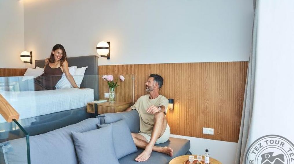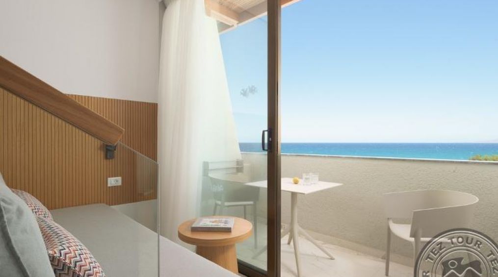 standard room SV (изглед море, 1-3 етаж, спалня отделена от малък салон със стъпало, основно легло – 2 единични (спална на запитване), доп. – диван, макс. 3 чов., 23,5 м2);