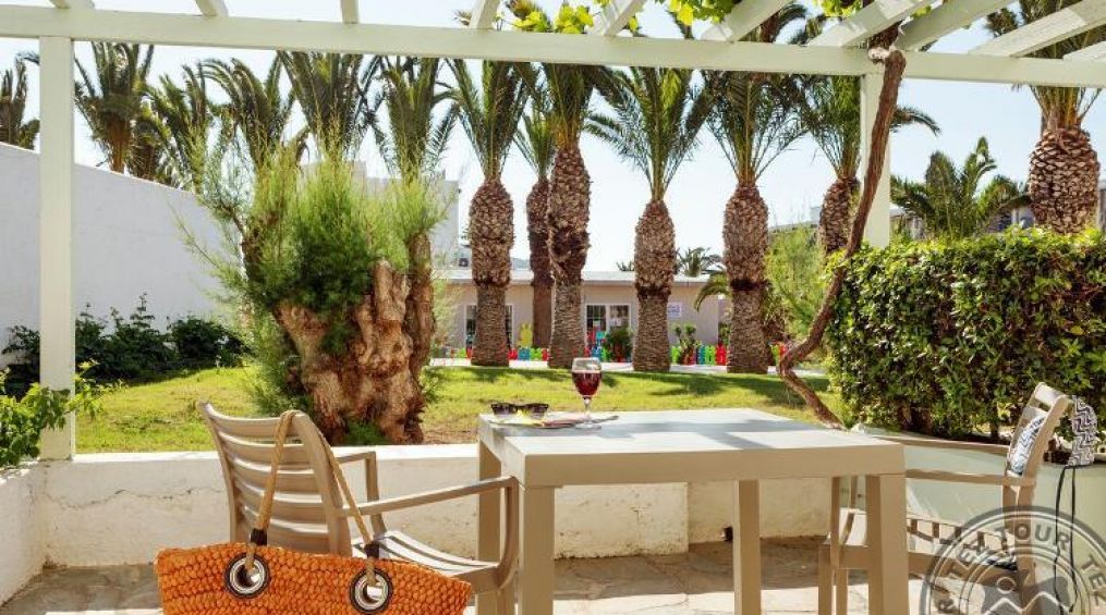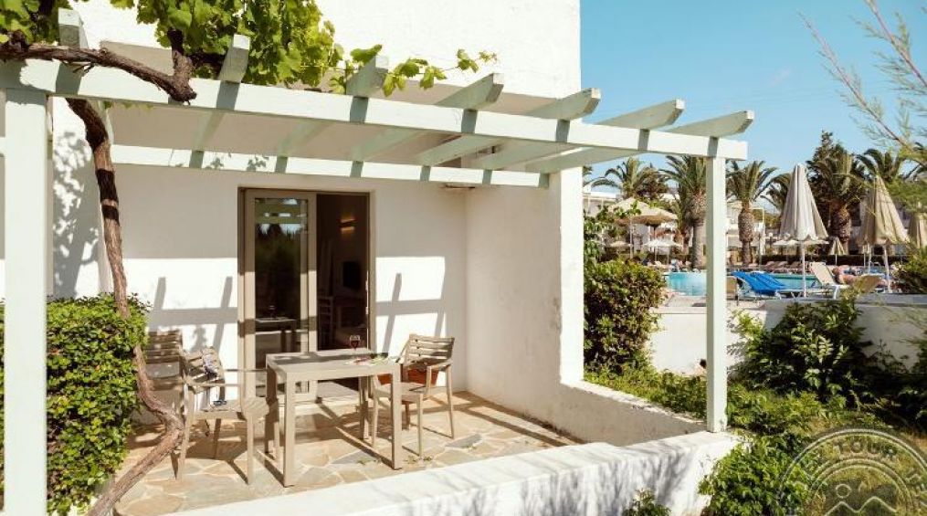 Bungalow GV/PV (гледка към градината и басейна, осн. легло – двуспално, доп. – 2 диван, макс. 2+2 чов., 28 м2), има стаи със стъпала;